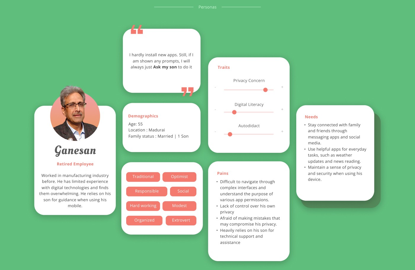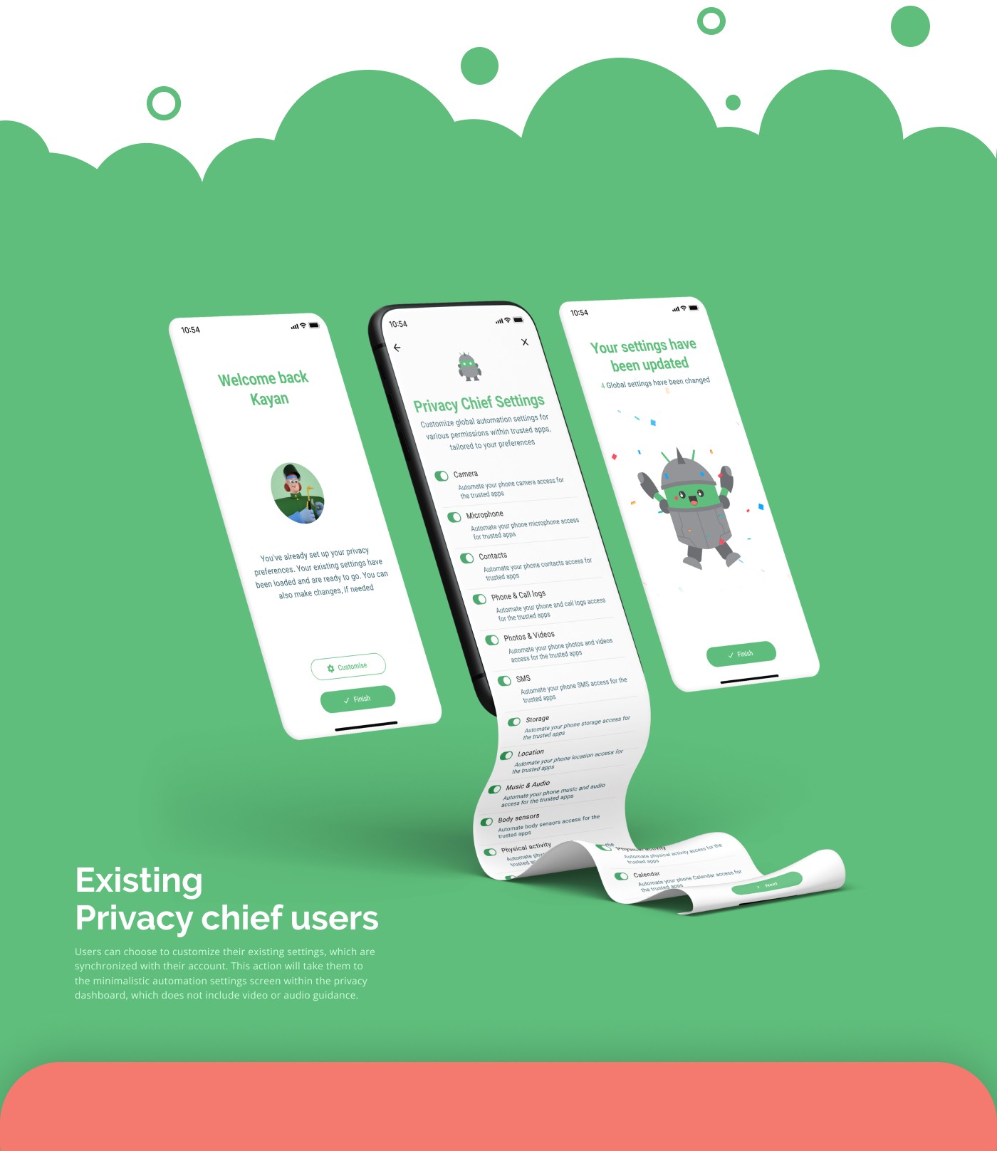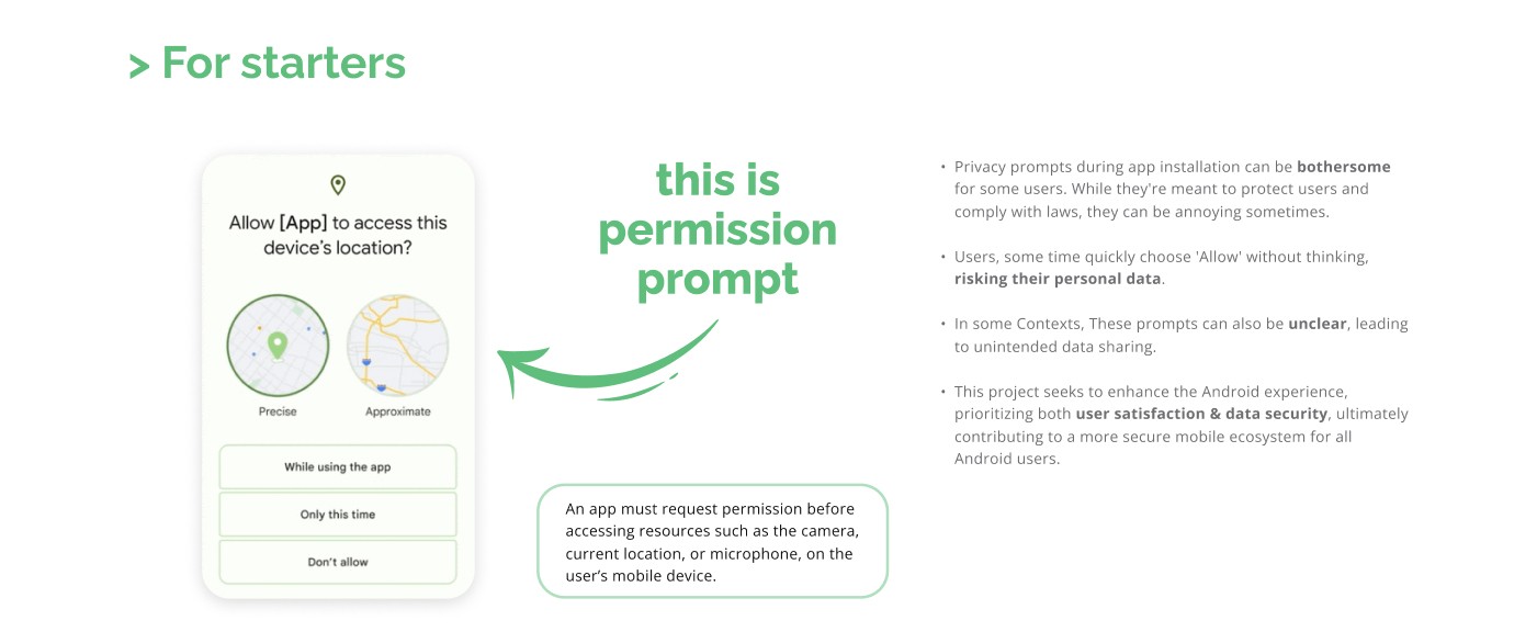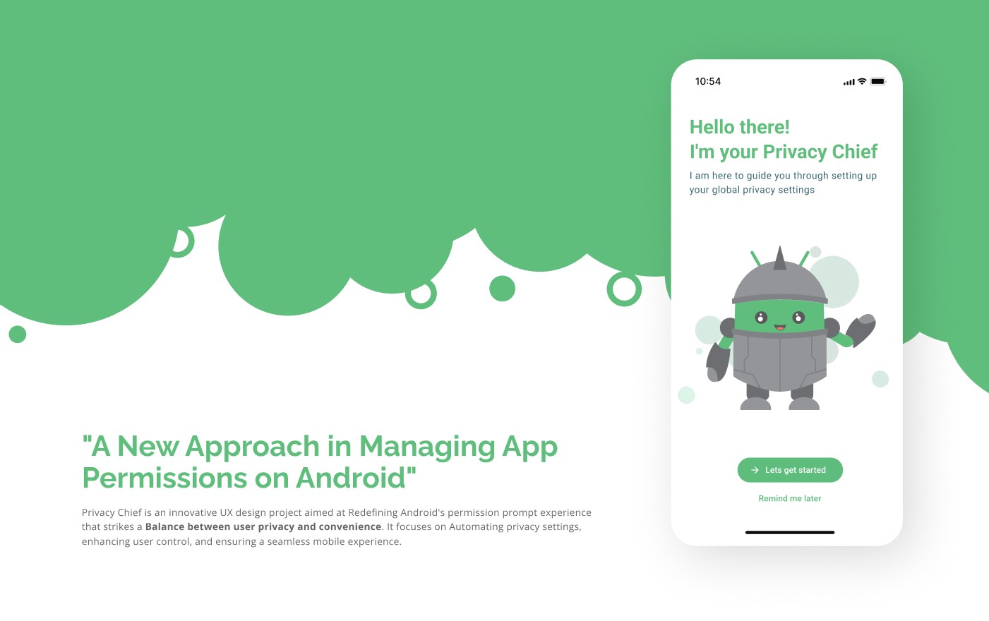 Privacy Chief is my semester thesis project at IIT Guwahati during my first year of the Master’s program. The project explores a unique approach to managing app permissions on Android, with a focus on balancing user privacy, clarity, and everyday usability. I started this project after observing how permission prompts during app installation often interrupt user flow and lead to rushed decisions. These patterns increase the risk of unintended data sharing and reduce trust in the overall mobile experience. Through Privacy Chief, I explored how Android’s permission system could become more transparent, contextual, and user-friendly without compromising security or app functionality. I focused on simplifying permission language, reducing cognitive load, and giving users more control through clearer explanations, ethical defaults, and personalization.